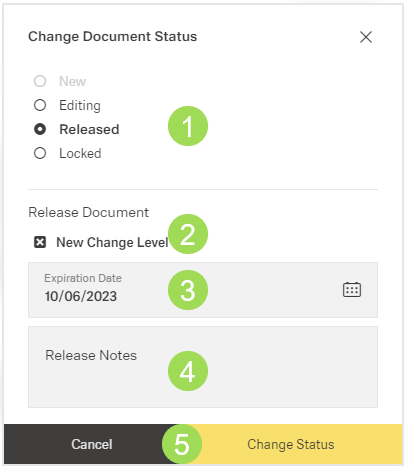 The illustration shows the window for document release: (1) select status, (2) set "new change level", (3) set expiration date, (4) edit field for release notes, (5) buttons