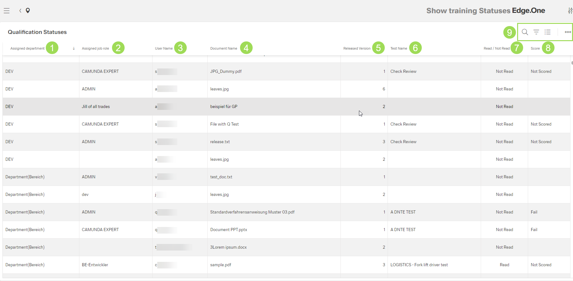 The illustration shows the table with information on the qualification statuses: (1) column "Assigned Department", (2) column "Assigned Job Role", (3) column "User Name", (4) column "Document Name", (5) column "Released Version", (6) column "Test Name", (7) column "Read/Not Read", (8) column "Score", (9) standard action buttons to sort and group the table
