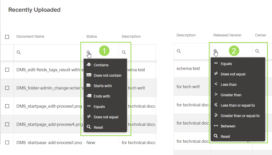 | Equals | result shows only cells containing text that is the same as the cell content |