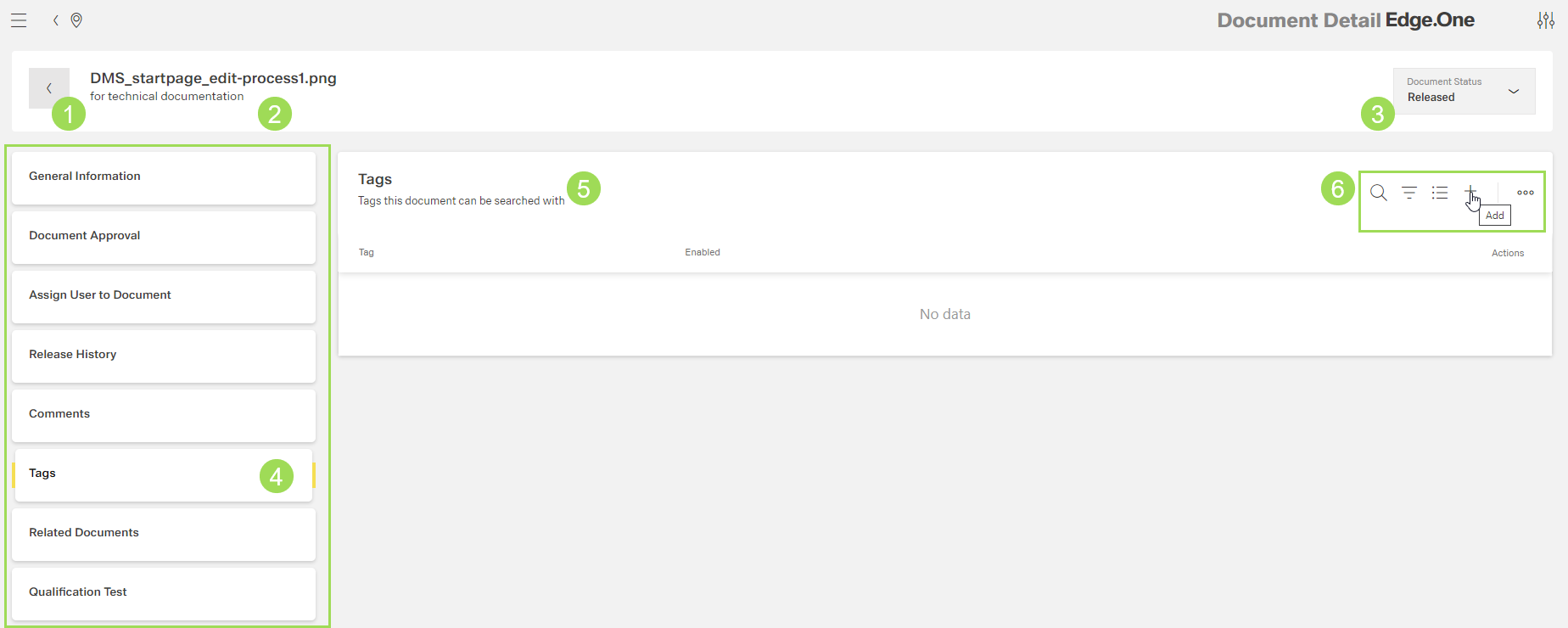 The illstration shows the general screen and its main elements: (1) button to return to the document list, (2) document name and description, (3) information on document status, (4) main navigation, (5) tags assigned to this document, (6) standard action buttons to sort and group the table