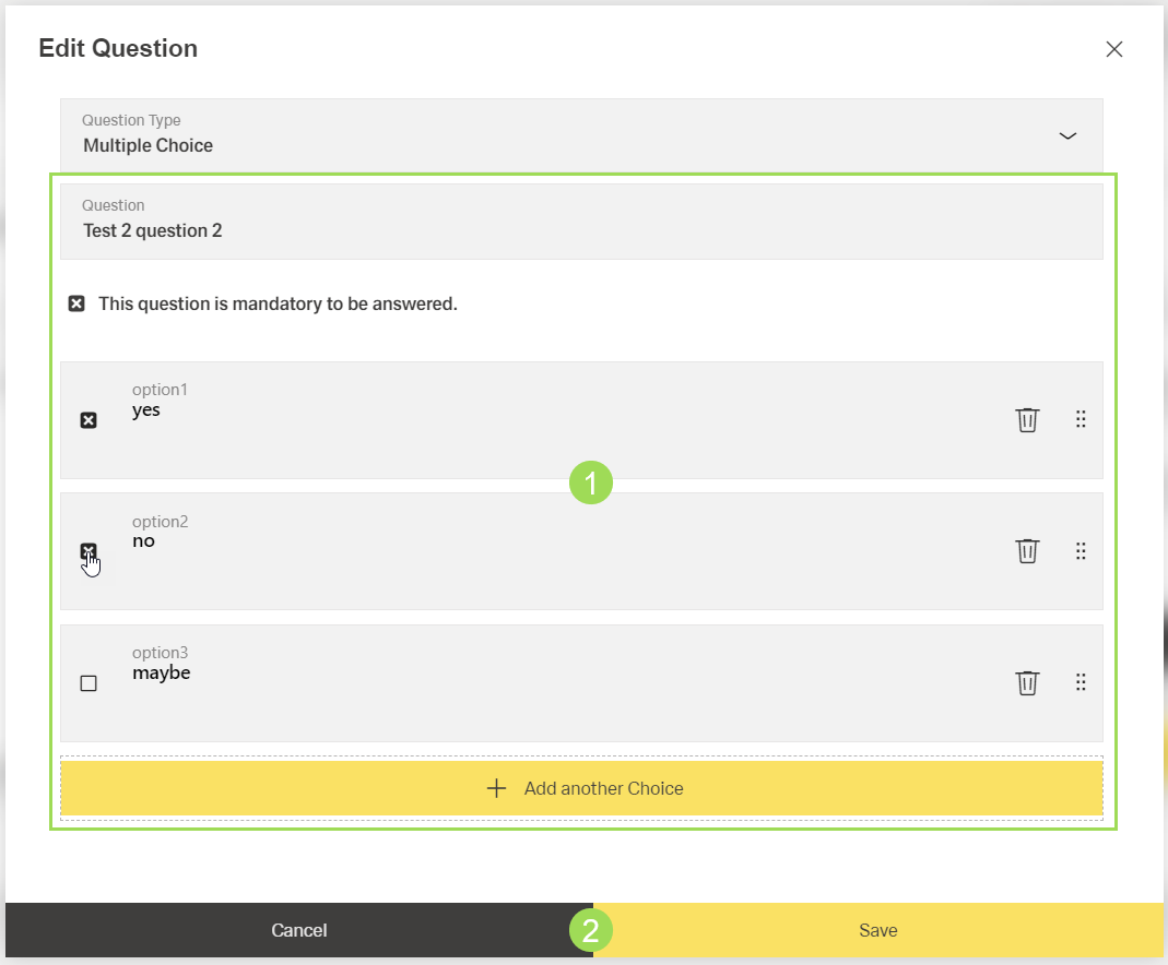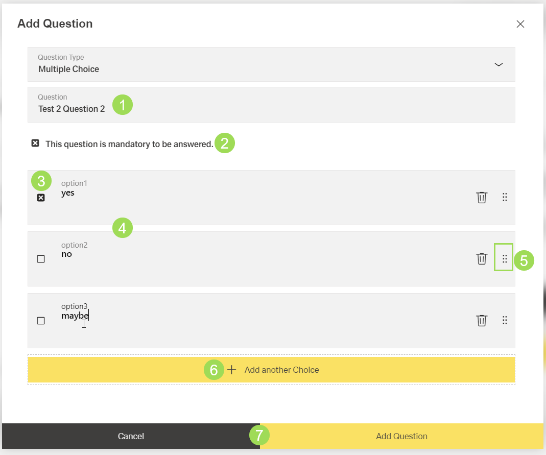 (1) question name, (2) checkbox if question needs to be answered, (3) checkbox to indicate correct answer(s), (4) possible answers, (5) option to change the order of answers, (6) button to add another possible answer to the question, (7) buttons