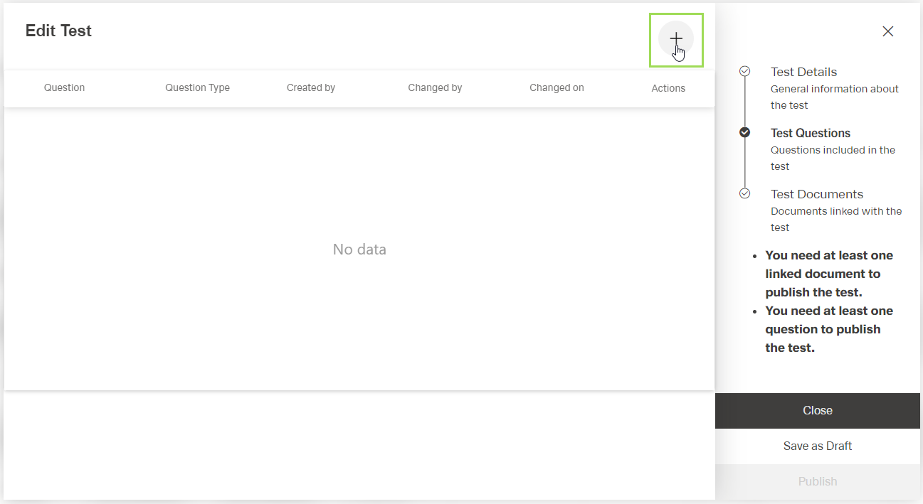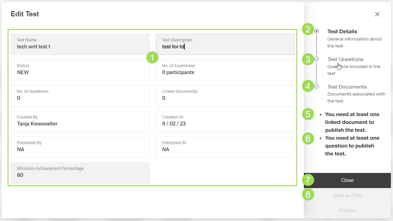 (1) test detail fields, (2) currently active submenu "Test Details", (3) submenu "Test Questions", (4) submenu "Test Documents", (5) information on submenu "Test Documents", this information disappears when a document is linked to the test, (6) information on submenu "Test Questions", this information disappears when a question is added, (7) button