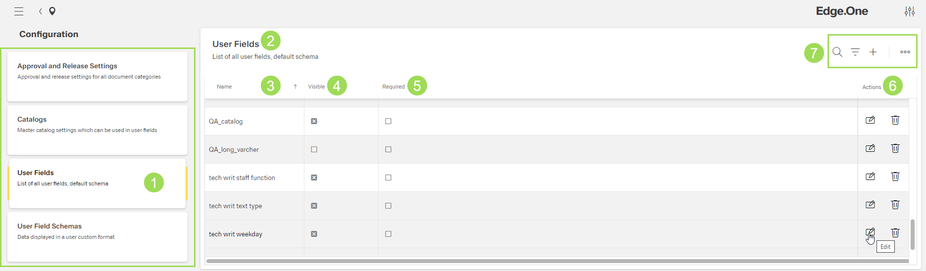 The illustration shows the submenu "User Fields": (1) main submenu bar, (2) header of the table with information about user fields, (3) column "Name", (4) column "Visible", (5) column "Required", (6) standard action buttons for a selected row/element, (7) standard action buttons to sort and group the table