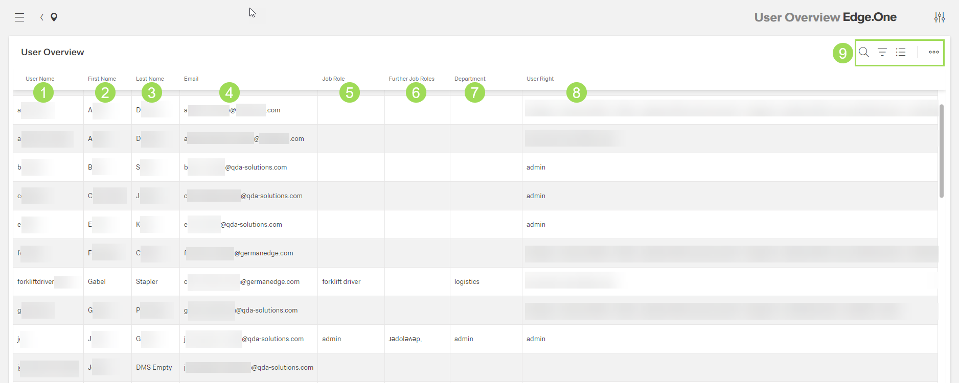 The illustration shows the table with information on the users: (1) column "User Name", (2) column "First Name", (3) column "Last Name", (4) column "Email", (5) column "Job Role", (6) column "Further Job Roles", (7) column "Department", (8) column "User Right" for the different modules, (9) standard action buttons to sort and group the table